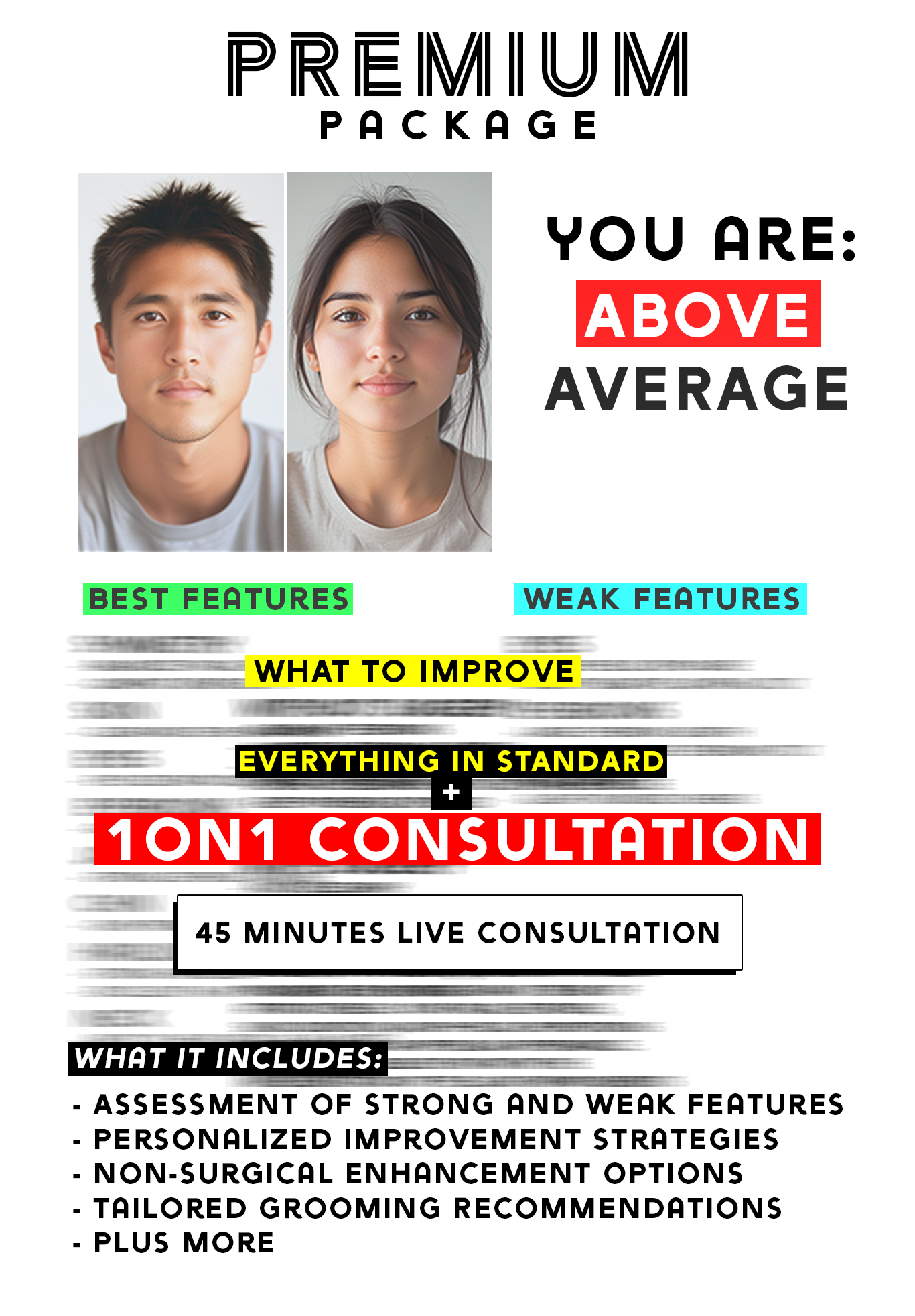 “I offer three packages for facial analysis with guaranteed privacy. The basic package provides an honest facial assessment. The second package includes a detailed facial assessment with personalized advice on how to enhance your appearance. The third package includes everything in the second package, plus a 45-minute 1-on-1 live video consultation with me. During this consultation, you and I will examine your features together in real-time, and I'll answer any questions you may have.”